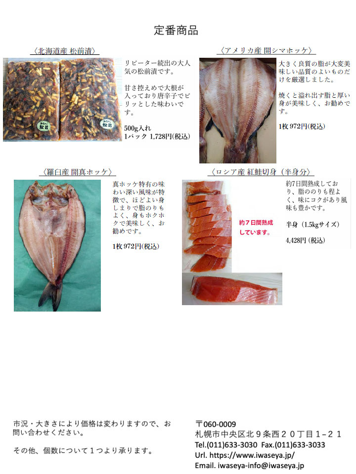 | 9月~10月 | 生筋子(秋鮭筋子)、ボタン蛯 |